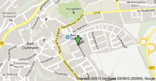 Wasserhohl 8, 67098 Bad Dürkheim (ca. 250 vom Bahnhof und ca. 150 m vom Parkhaus Am Obstmarkt entfernt)